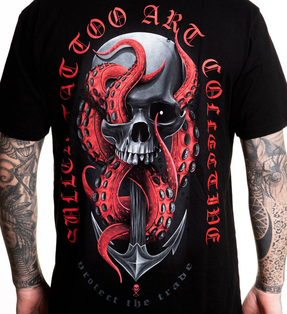 Voyage dives deep with a steel skull, wrapped tight in blood-red tentacles and anchored dead center. High contrast, clean lines, serious weight and movement behind every detail.