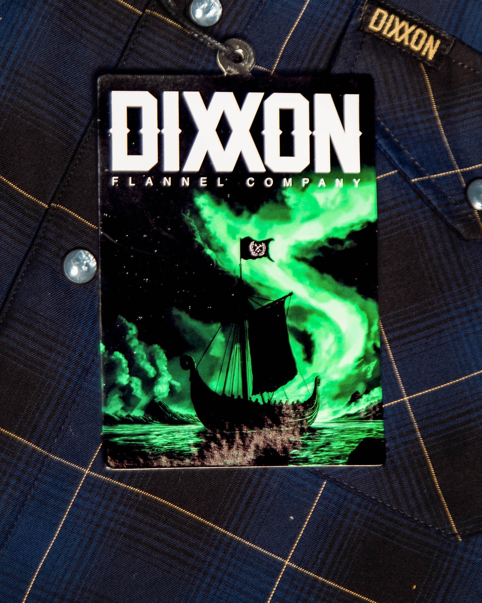 Black and gold Dixxon brand tag on the left chest pocket