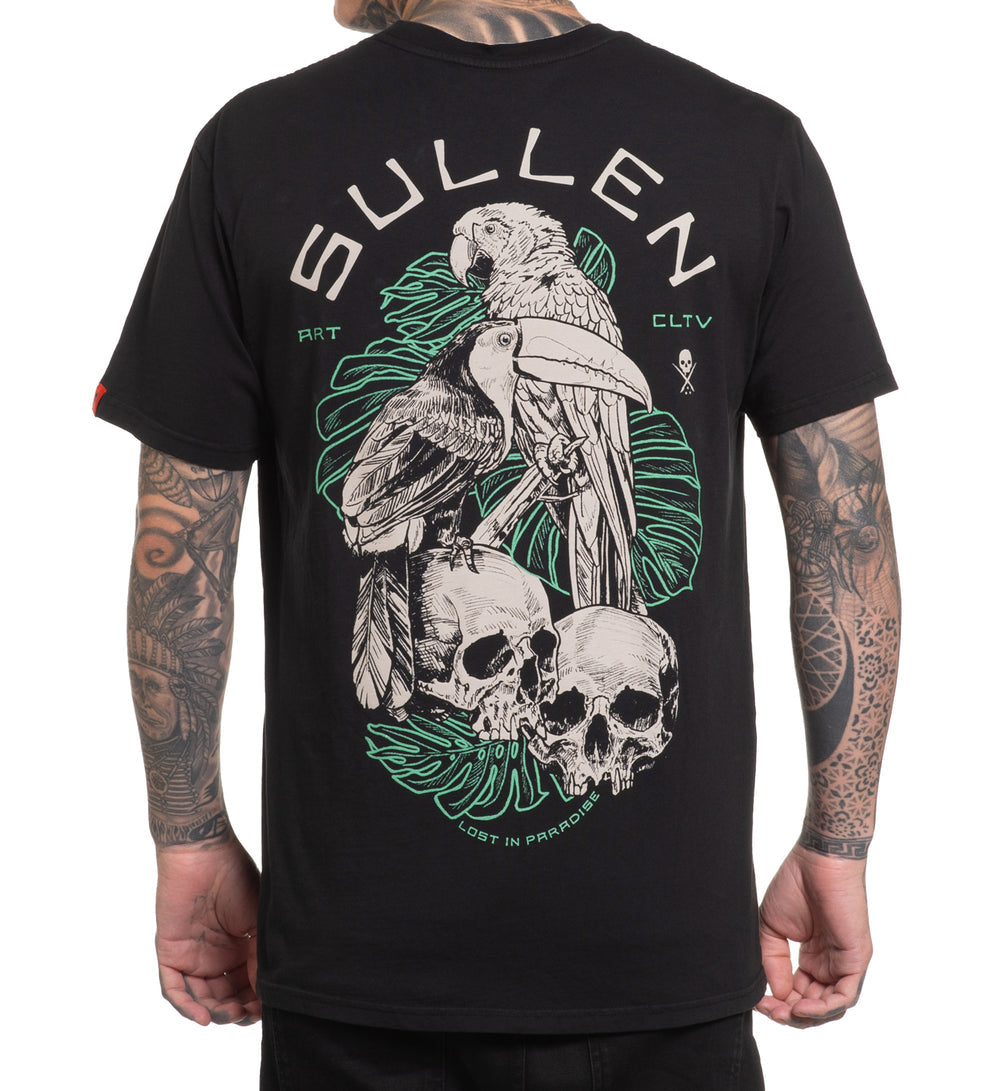 'Birds of Paradise' is a clean and detailed design for those who like to keep their wardrobe a little more sophisticated. Sketched birds and skulls stand out against sea-foam green palms and our pirate